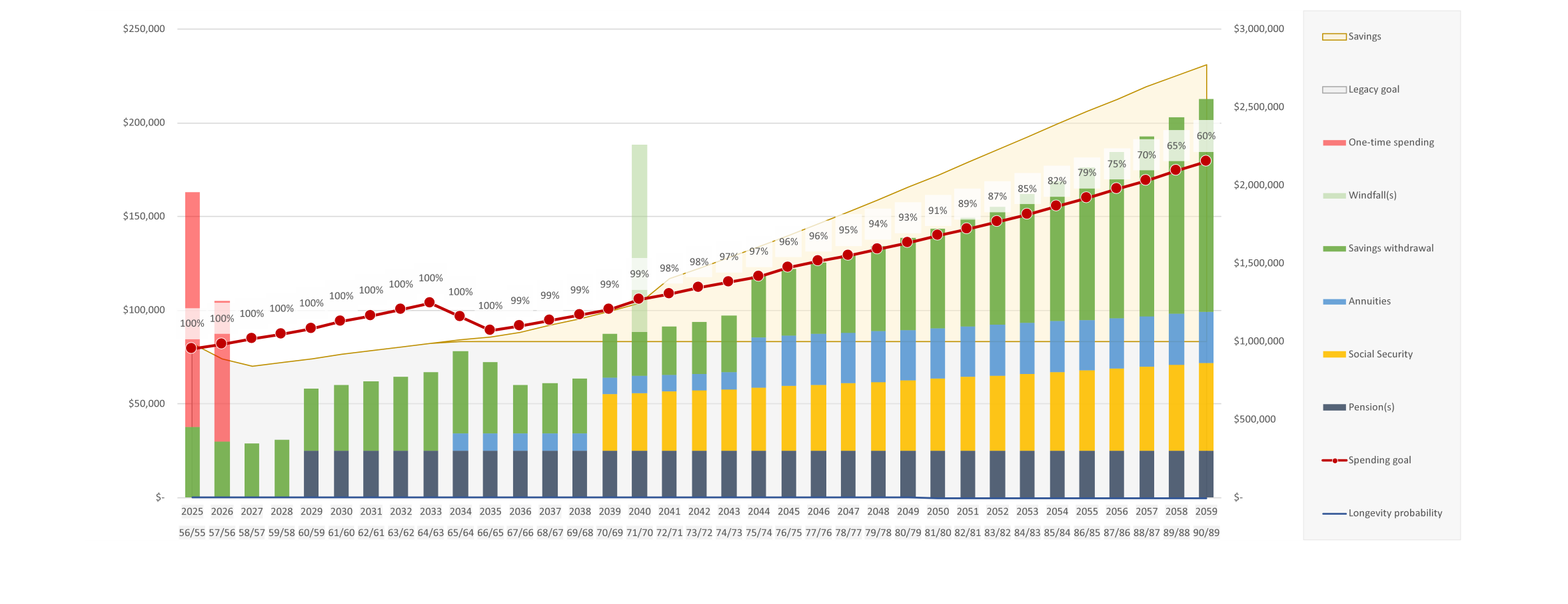 Assess your plan as-is or with alternative scenarios: withdrawal strategies, investment return fluctuations, high inflation, medical costs and other gotchas, just in case. See how your savings lasts compared to expected longevity and legacy goals.